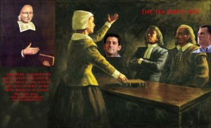 The Free Grace Controversy was a dispute over the saving of souls – essentially, whether the path to salvation was a private or public matter. Wheelwright and Hutchinson believed in the Covenant of Grace, the possibility of spiritual grace received by private revelation. Their opponents believed in a Covenant of Works, public gestures sanctified by the religious oligarchs of the Colony (one of whom, John Winthrop, was my wife’s granddad the same number of generations back) – think of today’s Republicans in control of the state. One of the myriad reasons to vote for…and cast one’s fate elsewhere?